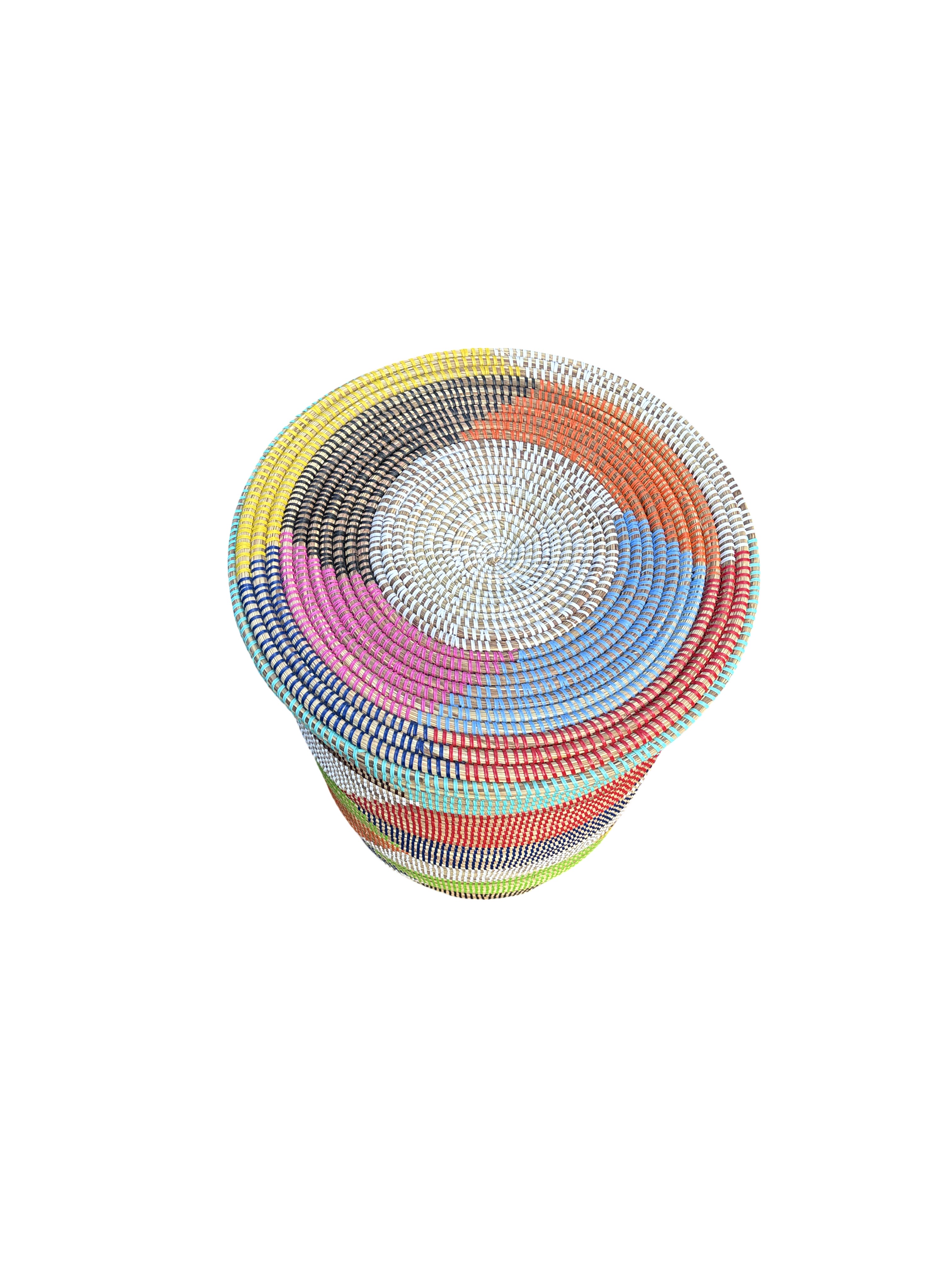Deze mooie manden worden handmatig gemaakt door vrouwen uit Senegal van gedroogde rietstengels met gekleurd wol draad en aan elkaar vastgenaaid. Hierdoor ontstaan mooie kleurpatronen, er zijn verschillende vormen mandwerk, variërend van diverse maten, diepe en platte schalen, mandjes met of zonder deksel, diverse maten en vormen met/ zonder deksel.